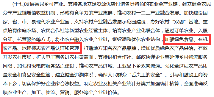 文件中的第十七點,提到了“加強綠色食品、有機農(nóng)產(chǎn)品認證和管理”