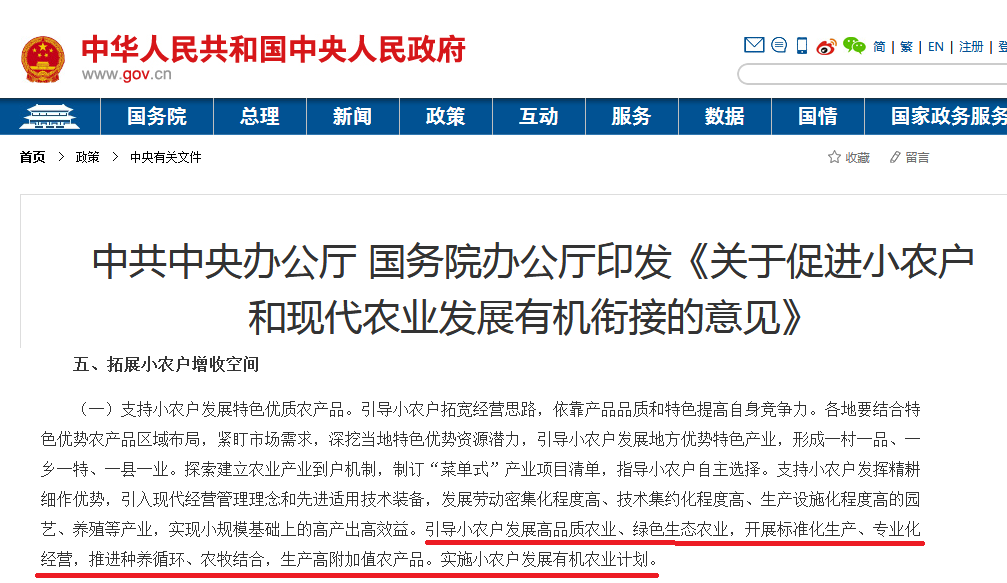 其中意見描述:“引導(dǎo)小農(nóng)戶發(fā)展高品質(zhì)農(nóng)業(yè)、綠色生態(tài)農(nóng)業(yè),開展標準化生產(chǎn)、專業(yè)化經(jīng)營,推進種養(yǎng)循環(huán)、農(nóng)牧結(jié)合,生產(chǎn)高附加值農(nóng)產(chǎn)品。實施小農(nóng)戶發(fā)展有機農(nóng)業(yè)計劃。”
